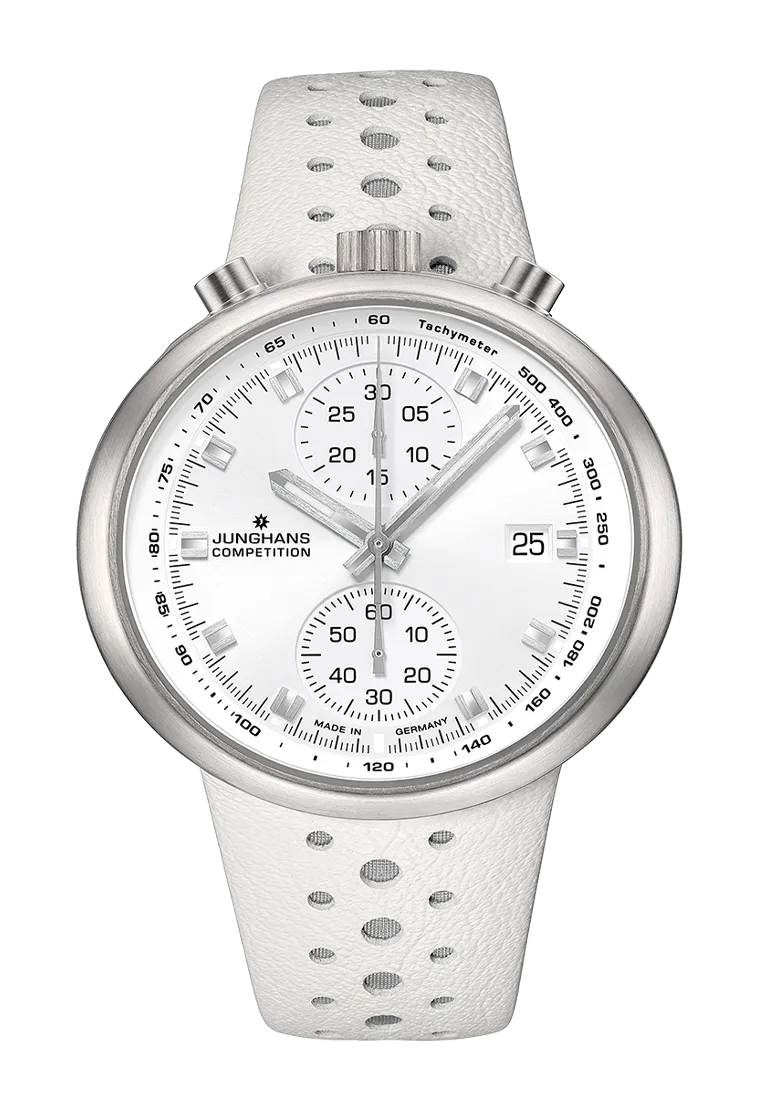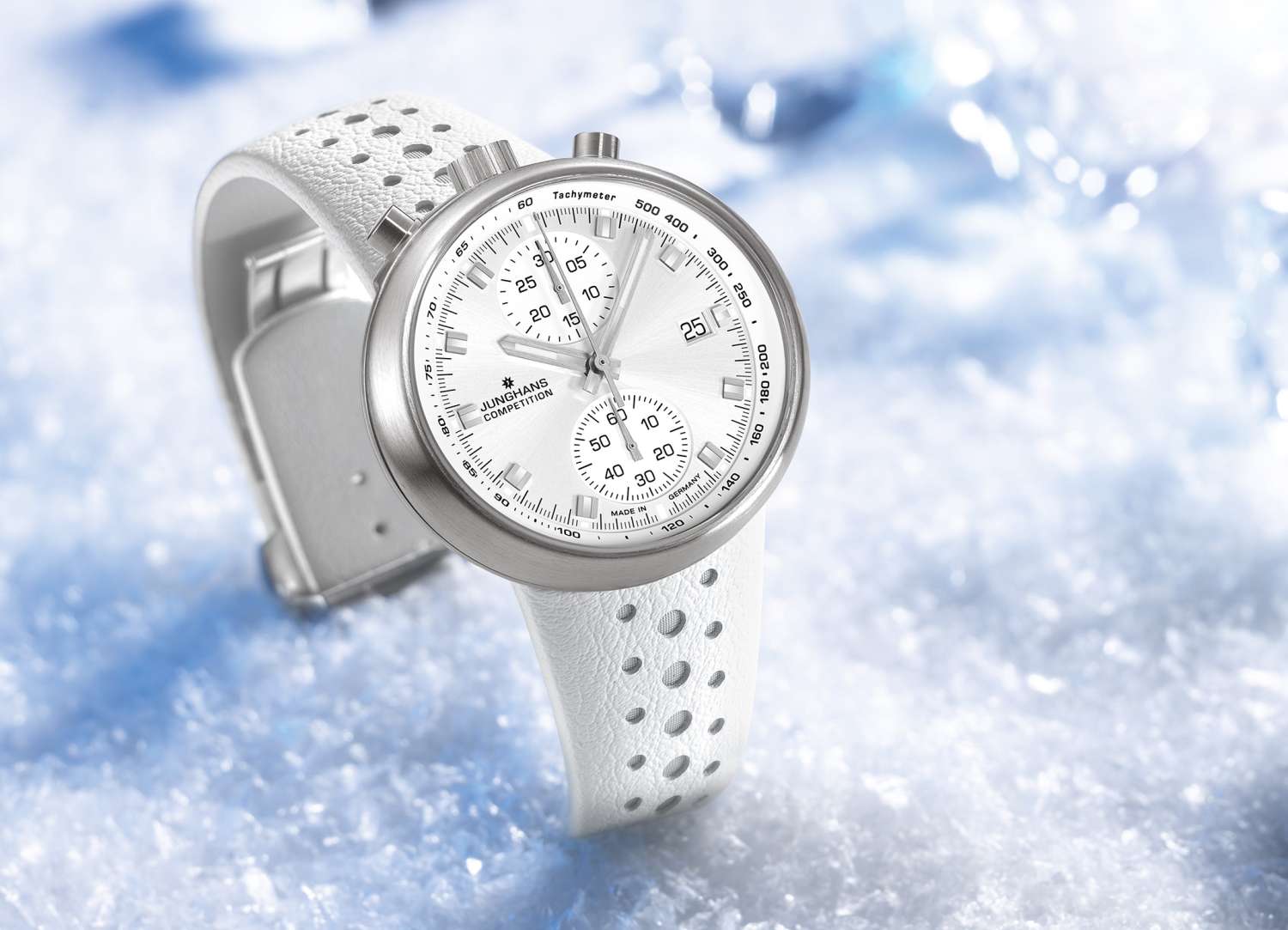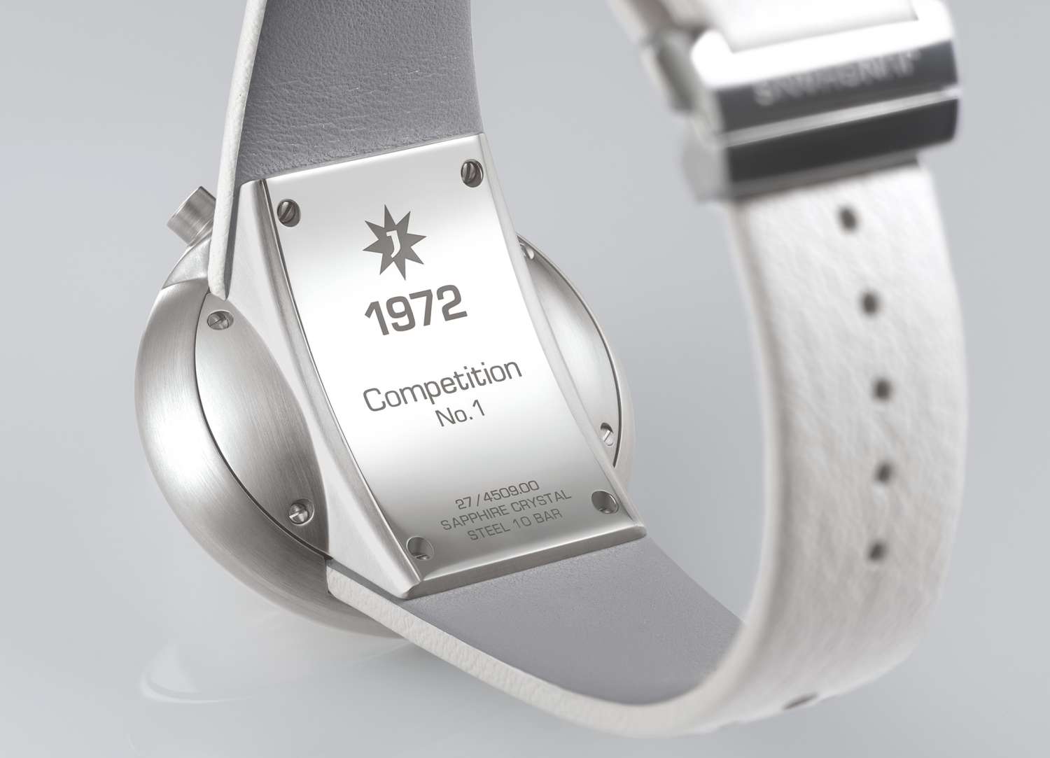 The shape of the 1972 Competition clearly refers to the design language of the seventies, when Junghans was the timekeeper at numerous sport competitions. With its oval case shape and the buttons and crown placed at the top in the style of a stopwatch, it makes a statement of extravagance on your wrist.
