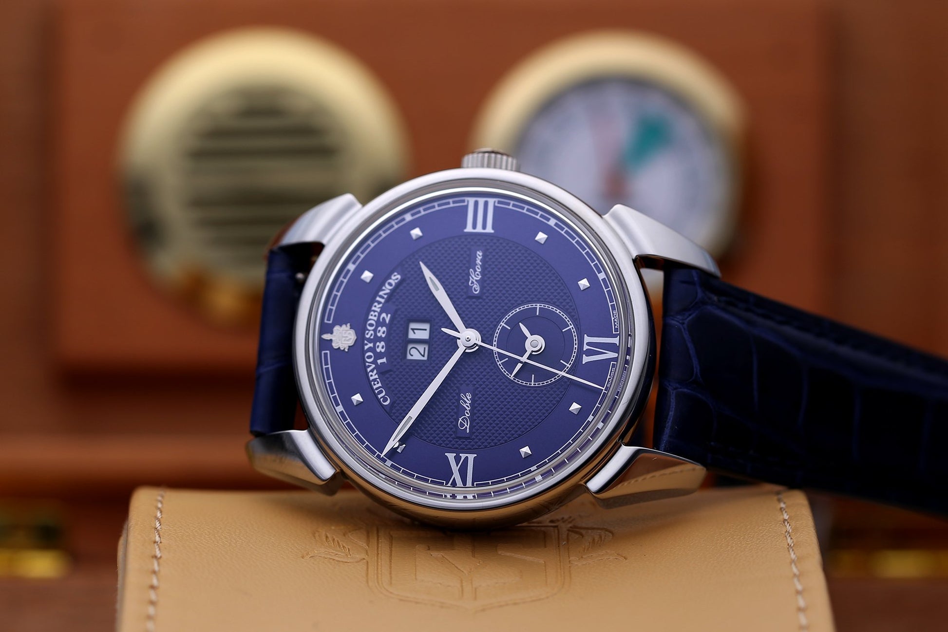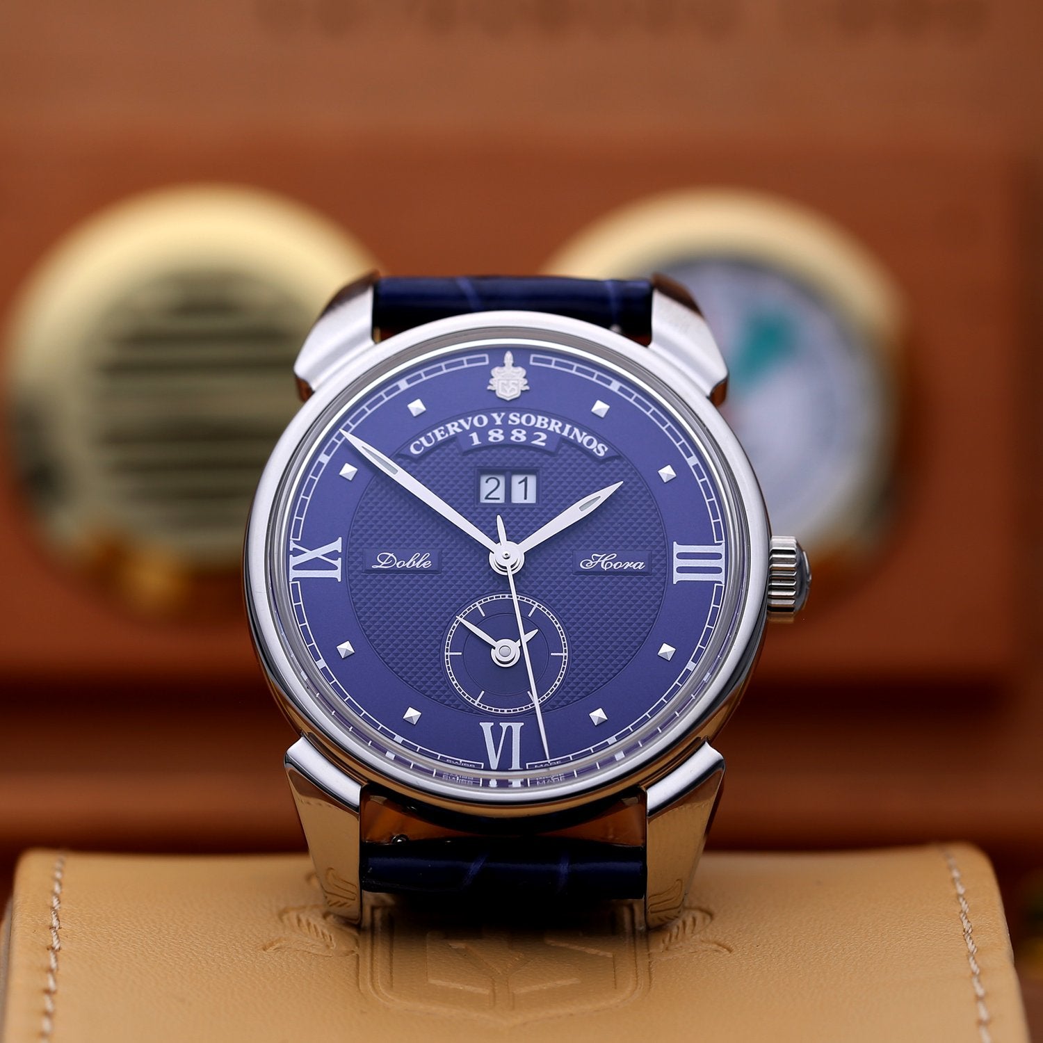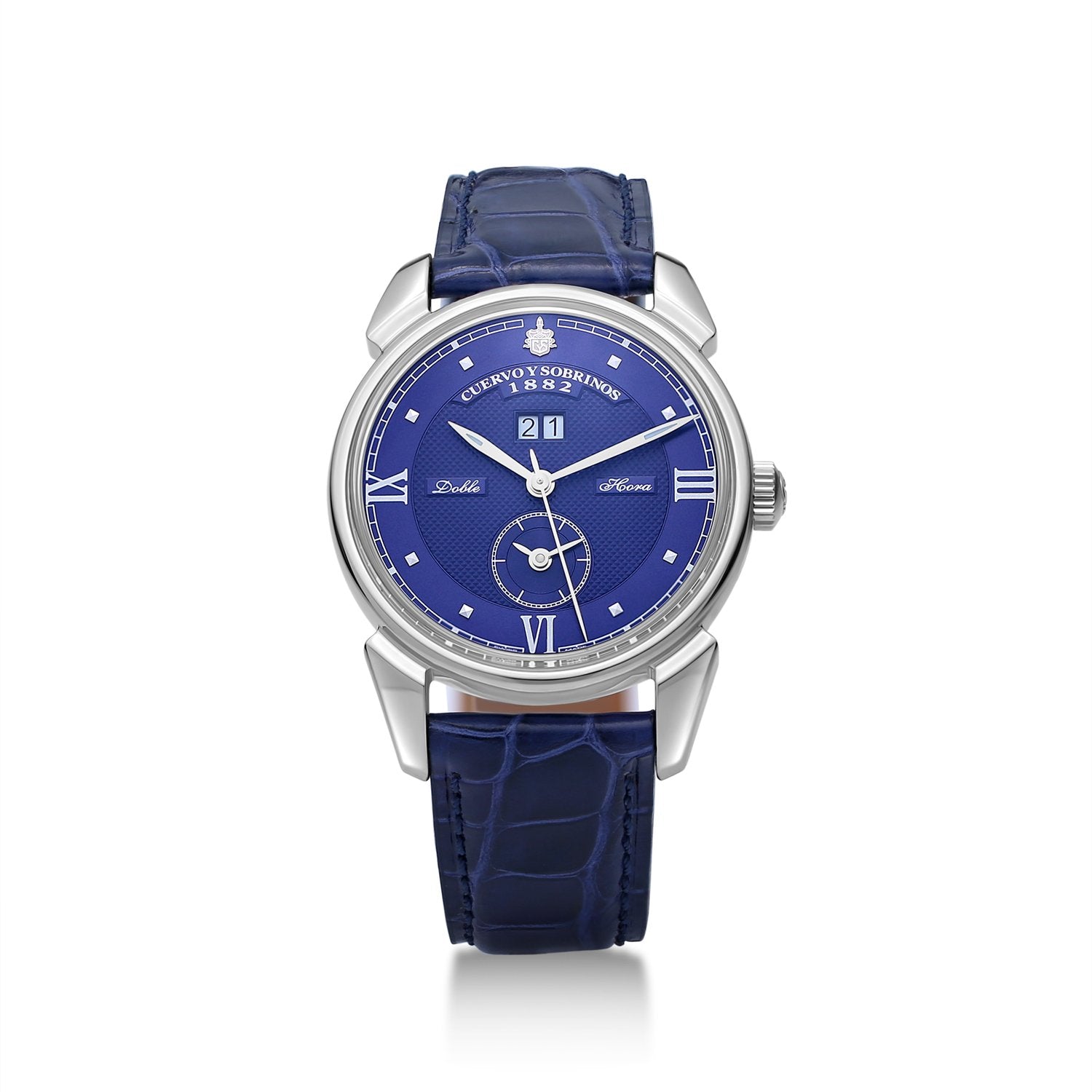 Historiador Doble Hora, Dual Time, Blue dial double hour /dual time dial / double curved sapphire crystal 3194D.1B . Male In-line AUTOMATIC made in SWITZERLAND CYS 6110 (Soprod TT651 base) 40 11.25 stainless steel case, sapphire crystal steel case, blue dial , silver hands, classic crown , 3 ATM , alligator strap , Original Deployant buckle 21 mm, 42 hours power reserve , 28800 hertz , engraved cys Hours, minutes , central seconds, second time at 6h