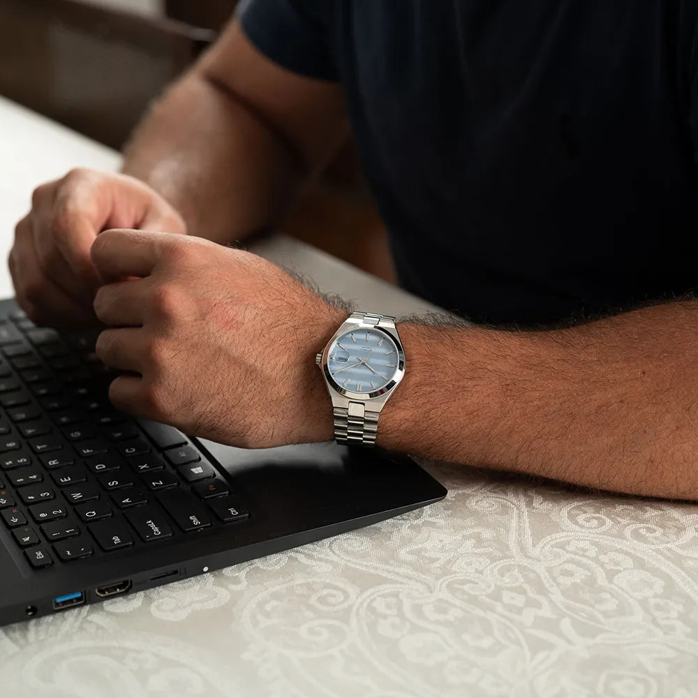 The finished blue dial brings elegance, with full index marking, pointers with luminescent coating and date positioned at 3am.