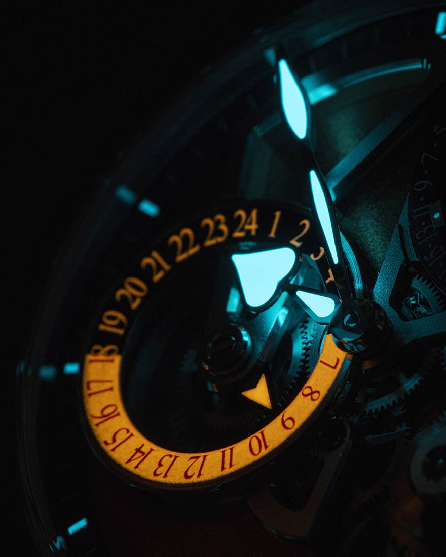 Dual time hand with grey matt Super-Luminova emitting orange glow