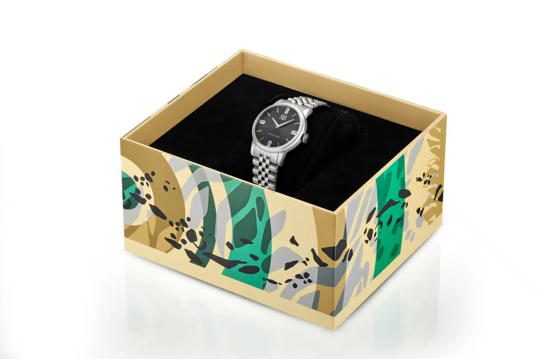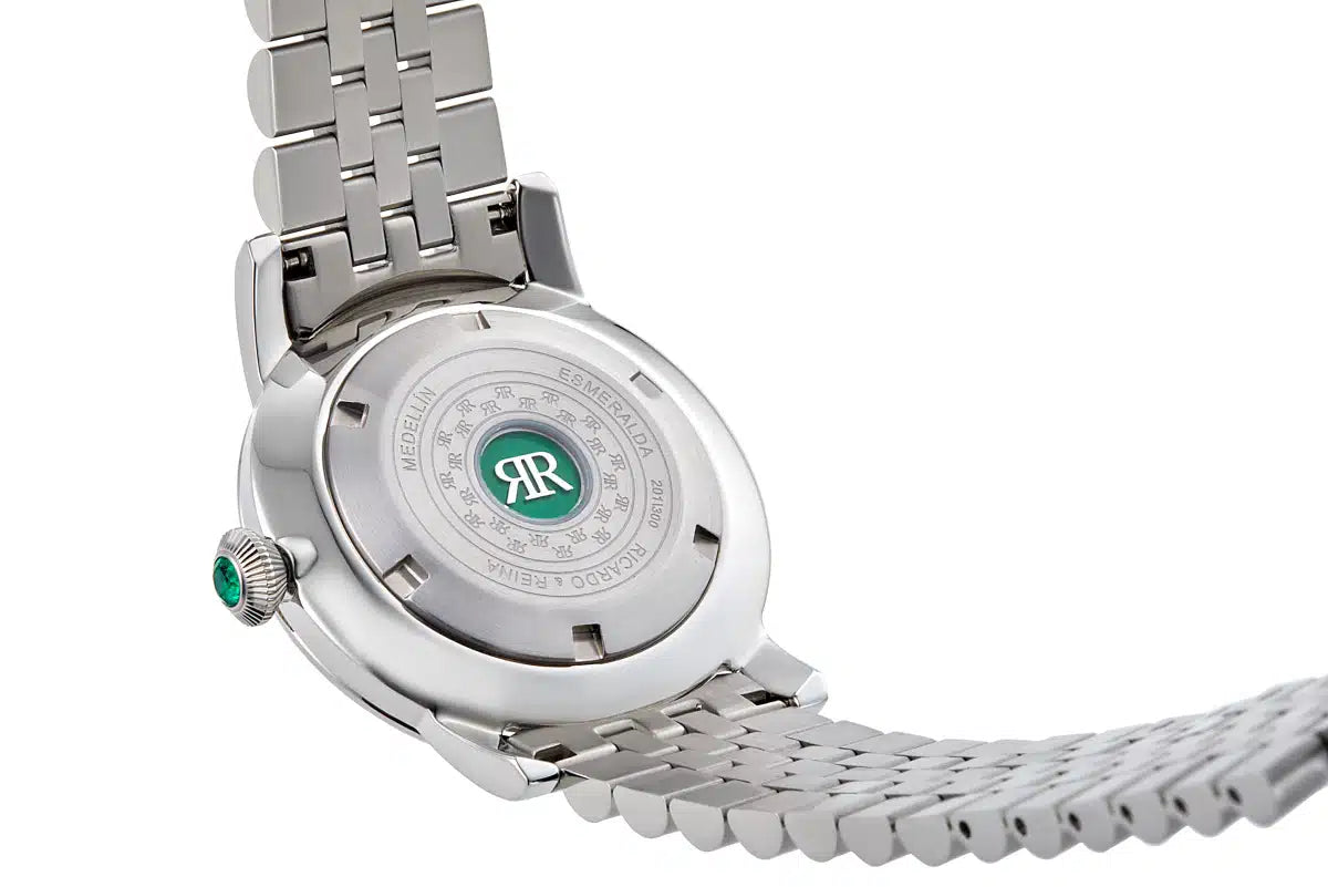 Esmeralda (Spanish for Emerald) is inspired by the Colombian emerald and pays homage to Colombia as home to the world’s finest emeralds. The hour markers at 12, 3, 6 and 9 are inspired by baguette shaped emeralds and the centre of these hour markers have been delicately finished in our signature Colombian Emerald green. A real Colombian emerald has been placed inside the eye-catching crown to complete the design of a timepiece that exudes luxury and timeless sophistication. All designs come with a Swiss Quartz Movement and a sapphire crystal encased dial. The Emerald in the crown is 100% real; always from conflict-free Colombian soil and is hand picked by our team of experts to meet our exacting quality requirements.