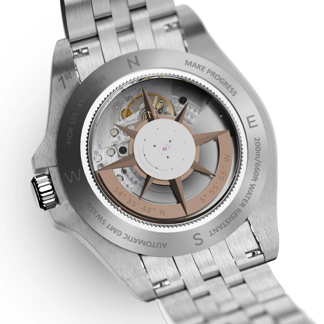 The Swiss made Sellita SW330-2 movement has been regulated in house, to within +/-6seconds and offers a whopping 56-hour power reserve. You can leave the watch off your wrist for a couple of days and pick up right where you left off without having to reset the time, date or adjust the 24hr hand. The sapphire caseback reveals a delightful and distinctive rotor, inspired by the compasses of early explorers, a symbolic reminder to always find your way home.