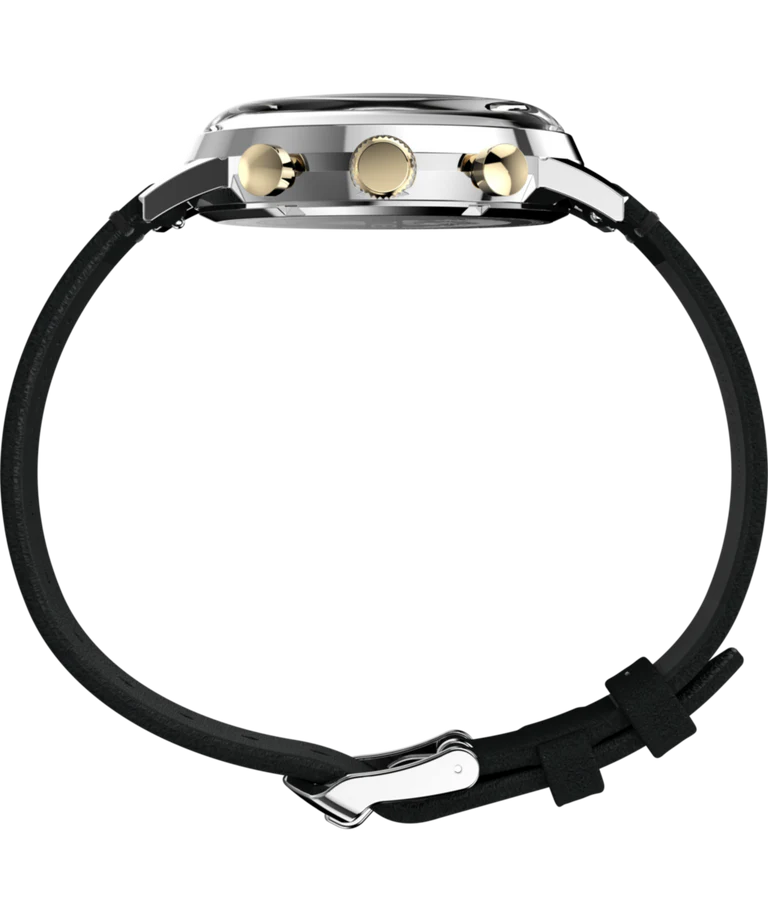 Our Marlin Quartz Chronograph Tachymeter was the first chronograph to join our Marlin line, as well as the first Marlin powered by a quartz movement. Beautifully detailed, it features a tachymeter index along its outer minute track to measure speed, as well as a unique date window placement and gorgeous gold-tone accents on its deep champagne dial. Paired with either an eco-friendly natural leather strap sourced from the Leather Working Group (LWG) with quick-release spring bars. Though its build broke new ground in our watchmaking heritage, this timepiece retains the classic Marlin features with a sturdy 40mm recycled stainless-steel case, domed acrylic crystal, and retro-style applied indices at 3, 9, and 12 o'clock.