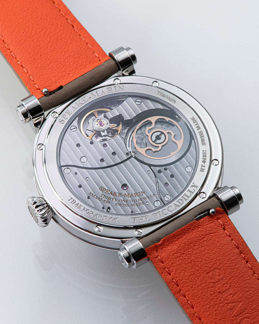 Inscriptions on the case back: Speake Marin – individual serial number HT-01857 – The Piccadilly – Titanium – hand-engraved “TIME FOR ART 1/1”