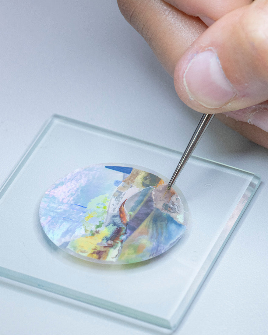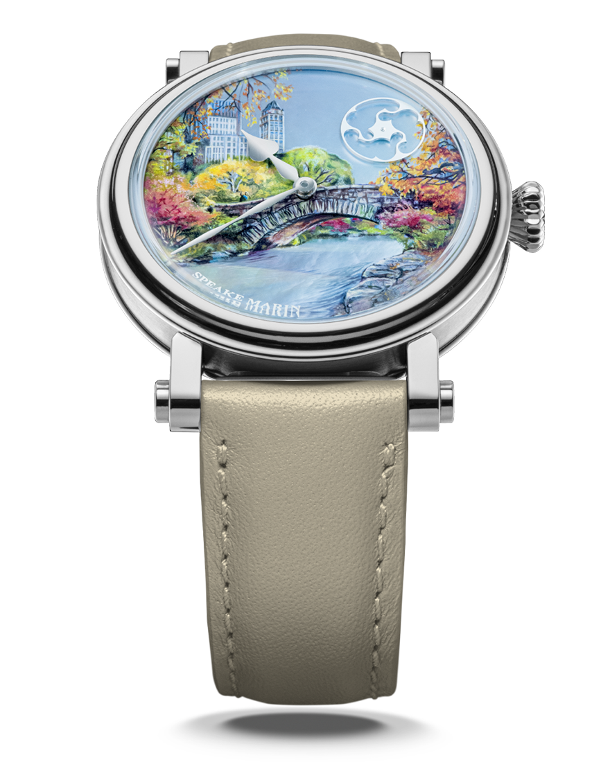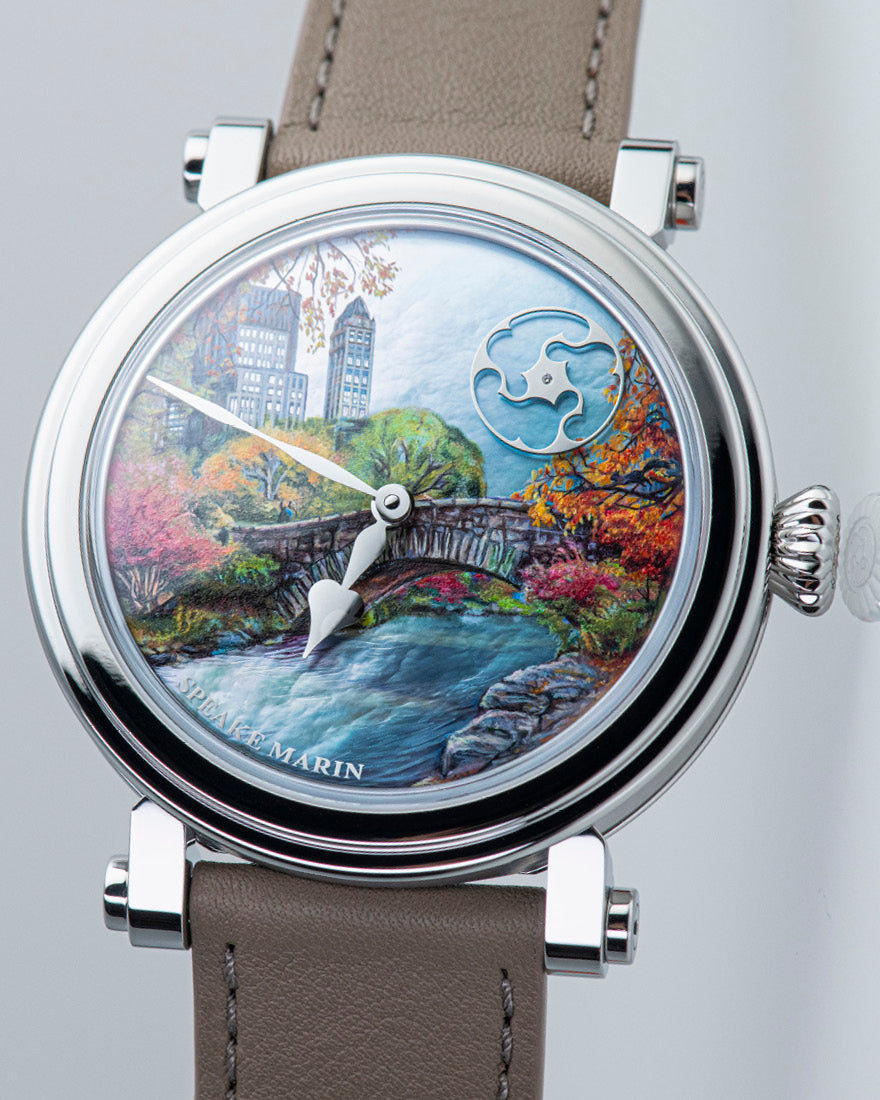 Handmade micro-painting on the MOP dial, depicting an autumn landscape with a focus on the Gapstow Bridge in New York's Central Park.