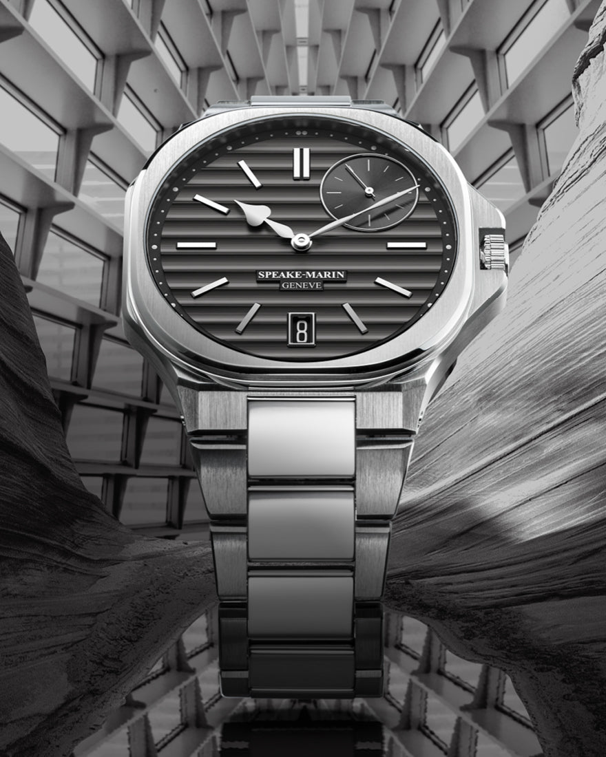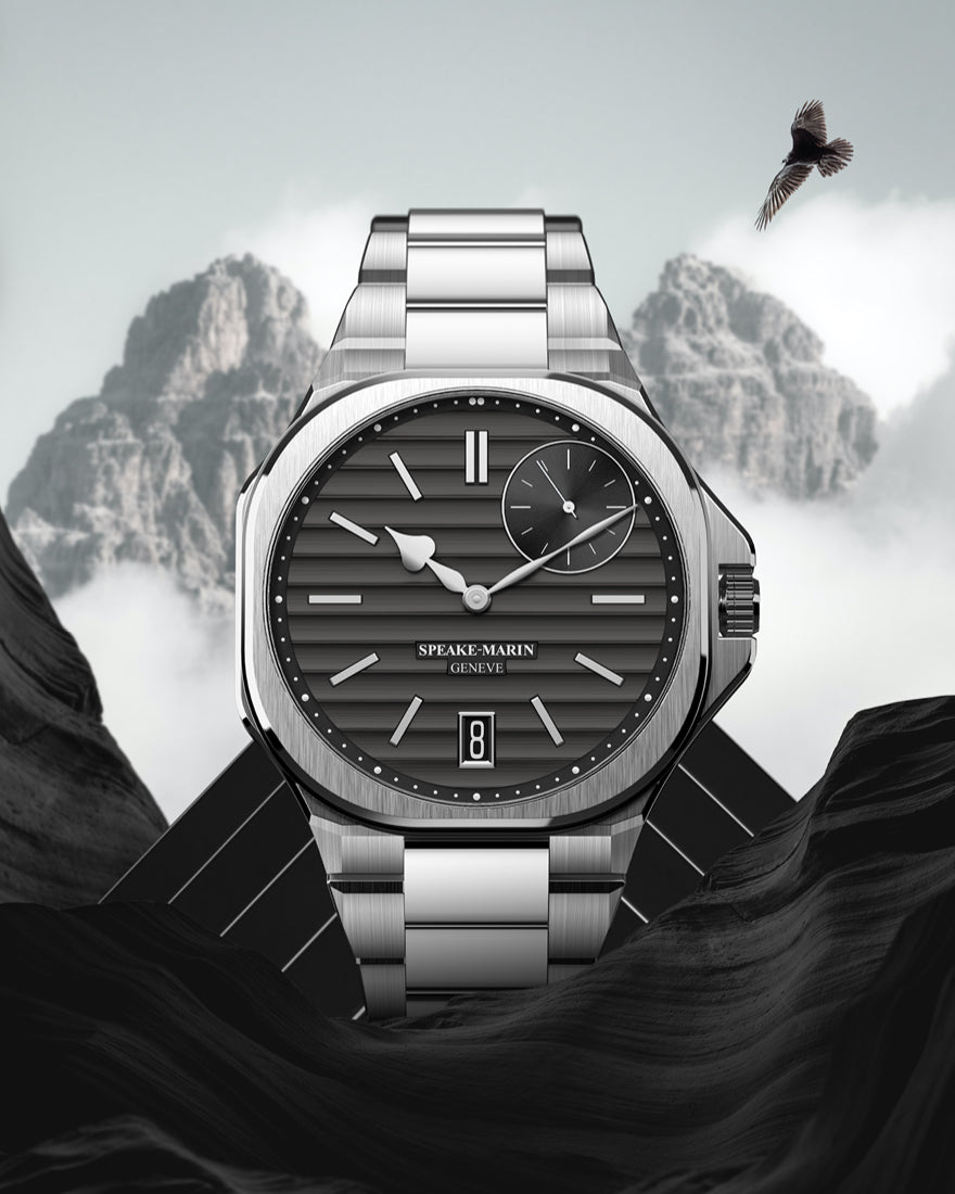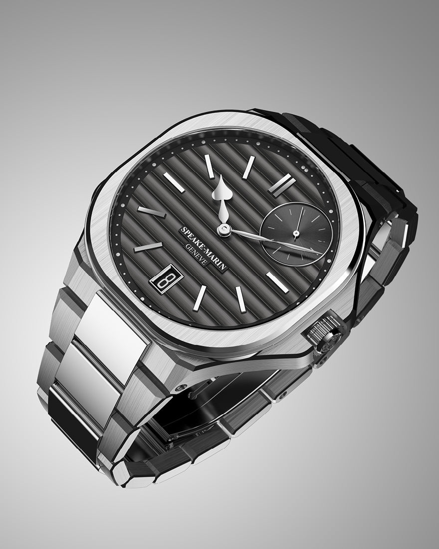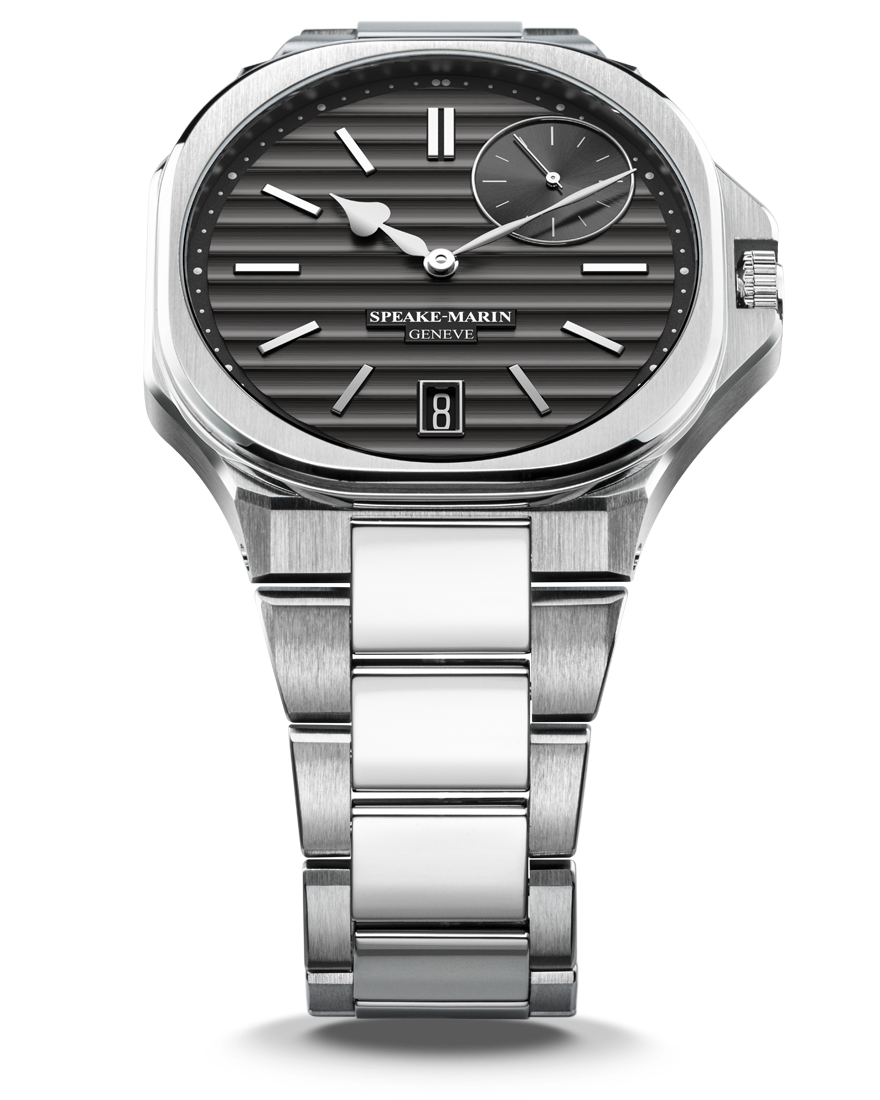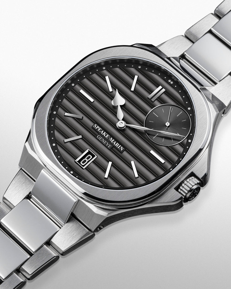 Black dial with «Ripples» finishing and polished indexes. Black small second counter at 1.30.