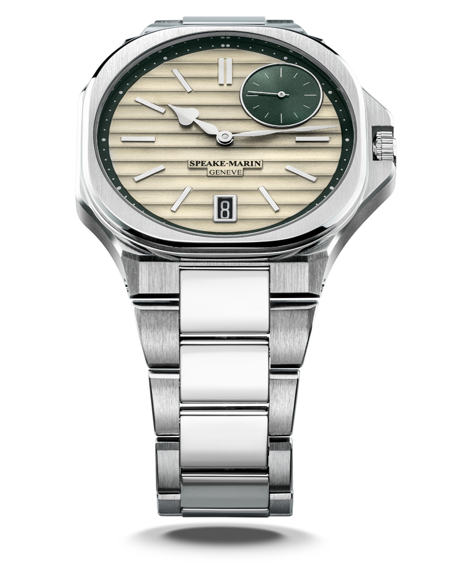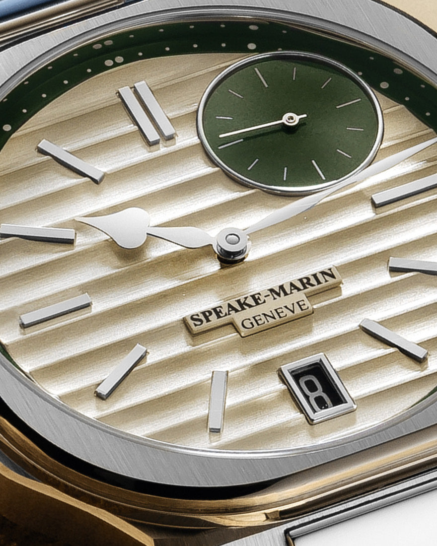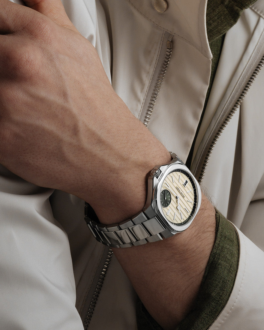 Rhodium-plated brass base, sand-coloured metallic dial with zapon treatment
