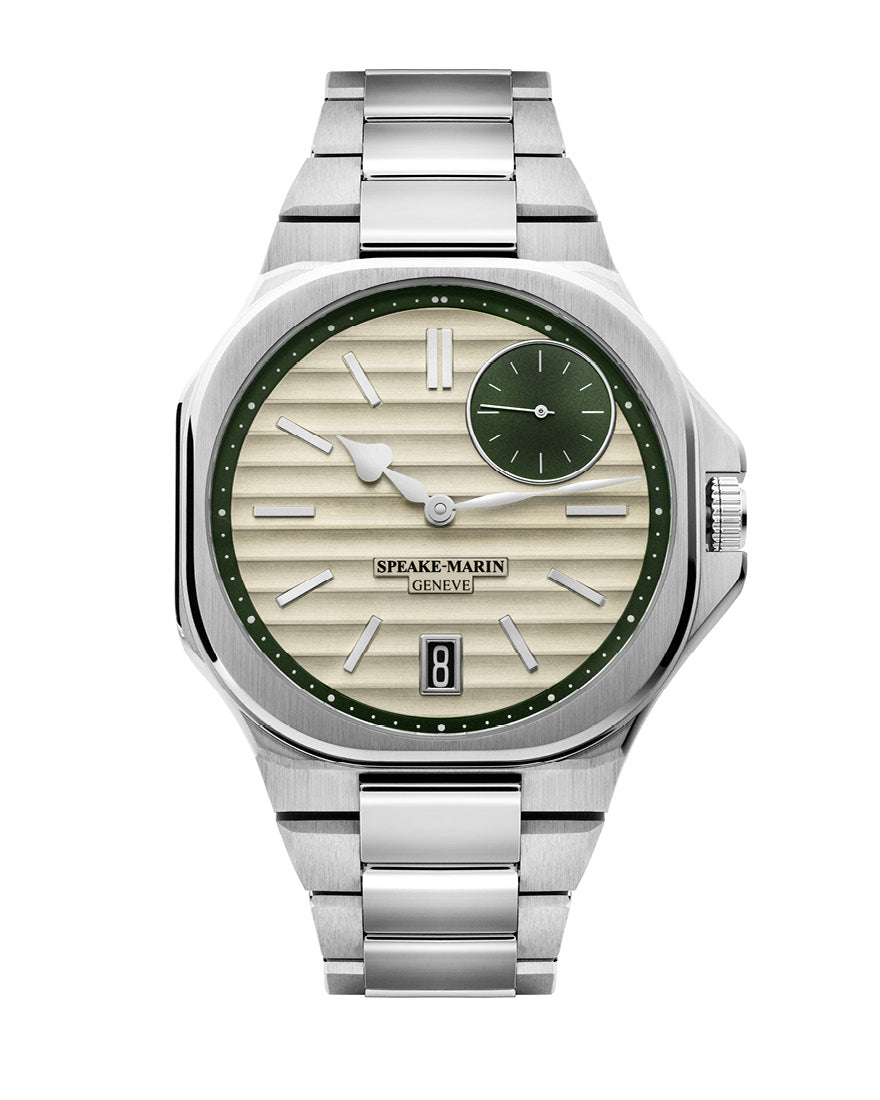 Green small seconds counter, sunray finish, glossy white seconds markers, polished rhodium-plated steel hand, rhodium-plated counter ring
