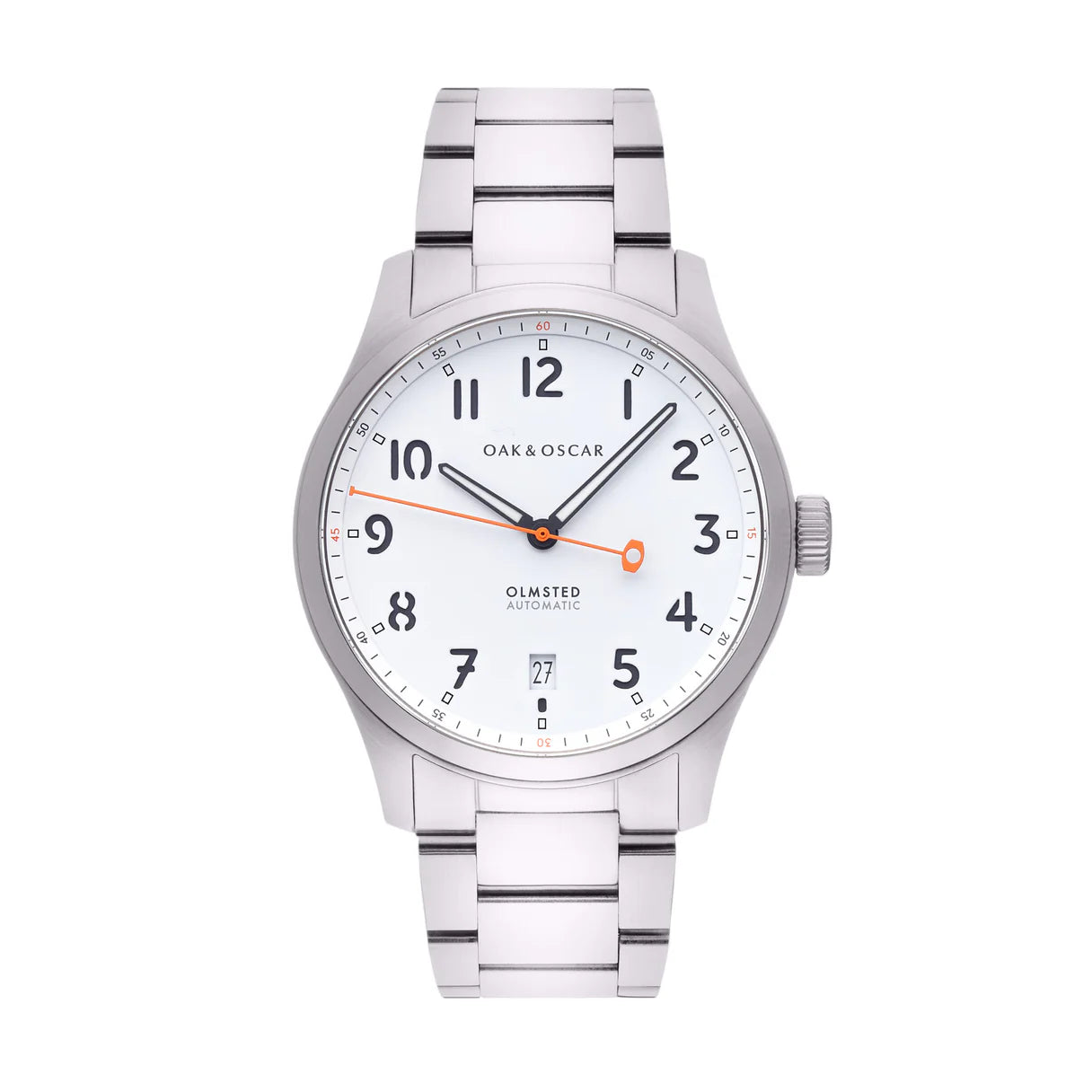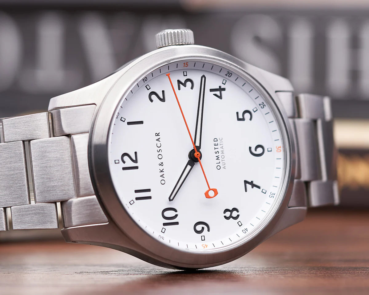 A classic, automatic winding, 38mm field watch with a two-layer sandwich dial, screw-down crown, and inner minute track with orange cardinal numeral accents.