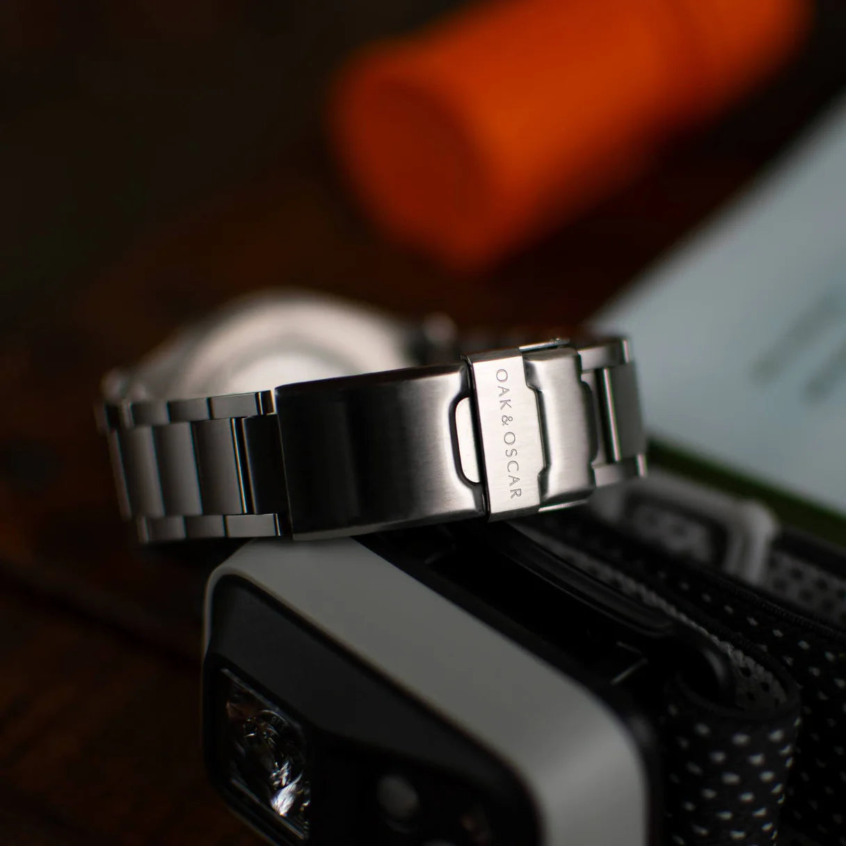 Available on either our handmade, Horween leather strap that tapers from 20mm to 18mm or our fully-articulating, tapered (20mm-16mm), brushed 316L stainless steel bracelet.