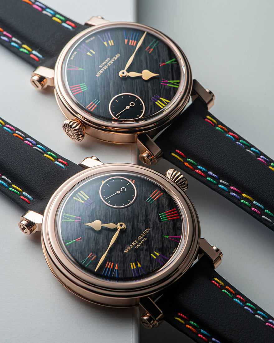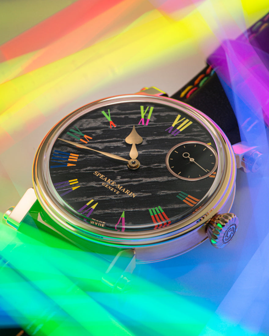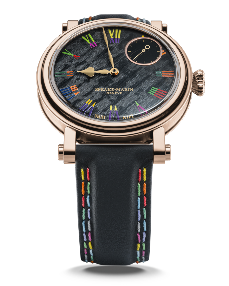 Multi-coloured roman numerals. Small black laquered dial at 1:30.